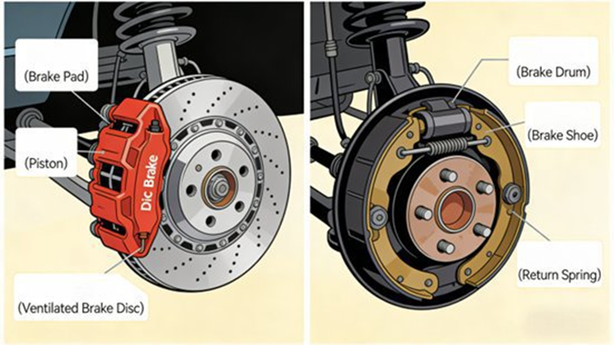 - Drum Brakes: Consist of a drum, shoes, wheel cylinder, and return springs. They offer immense braking torque due to a high lever ratio and low cost, making them ideal for the rear wheels of commercial vehicles. However, their closed structure limits heat dissipation, causing thermal fade during continuous braking. Configurations include leading/trailing, dual-leading, and self-energizing types.