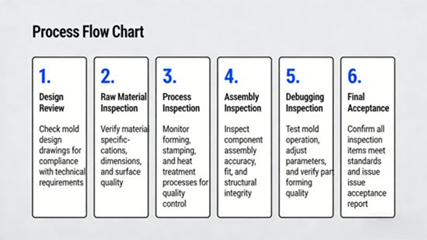 Details: At the design level, engineers run 3D interference checks. During manufacturing, teams use CMMs, projectors, and hardness testers to verify tolerances (like ±0.005 mm) after every machining step, while ensuring raw material traceability. Finally, during assembly, feeler gauges check fit clearances before the die undergoes strict trial stamping to guarantee part quality and production takt rate.