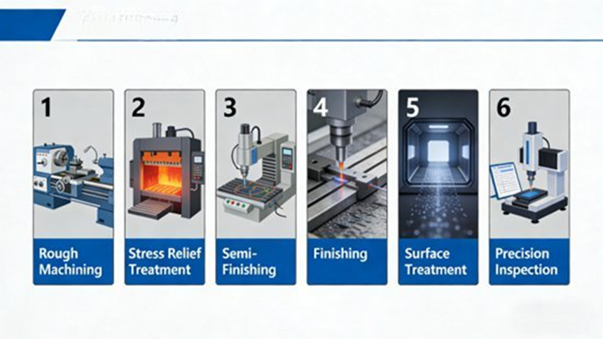 - Rough Machining: CNC milling removes raw material with a tolerance of ±0.1 mm and roughness of Ra ≤ 6.3 μm. Next comes stress relief aging (heating Cr12MoV at 200–250°C for 4–6 hours) to stop future distortion.