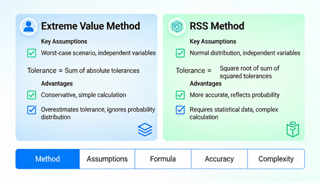 - Worst-Case Method: Calculates the absolute maximum and minimum limits of the final gap by assuming every part hits its extreme limit at the same time.