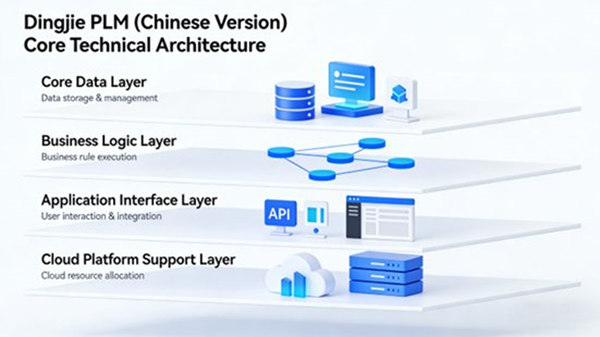 Dingjie PLM uses a cloud-native and microservices-based architecture built on an industrial internet platform. The report names three core technical traits: