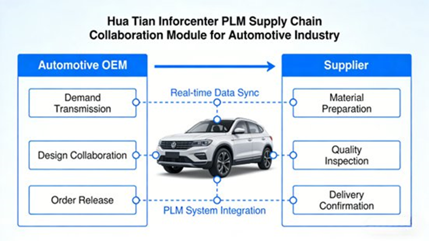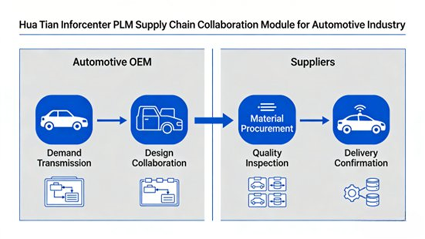 Automotive development needs close supplier cooperation, but OEMs still need to protect design IP, platform knowledge, and sensitive engineering information. Hua Tian PLM addresses this through its supplier collaboration portal and permission control system.
