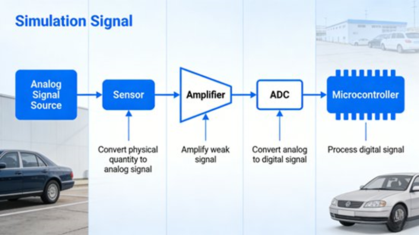 Common automotive analog signals include engine coolant temperature, intake manifold pressure, throttle opening, and alternator output current. They are especially vulnerable to EMI from ignition systems, motors, and harness coupling.