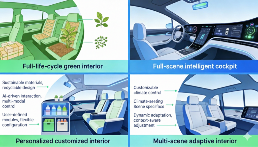 - Full Life-Cycle Green Design: We will move from partial green materials to full coverage. By 2030, the vehicle interior recycling rate should cross 90%. Solvent-free building and full “use-recycle-degrade” material loops will be the norm.